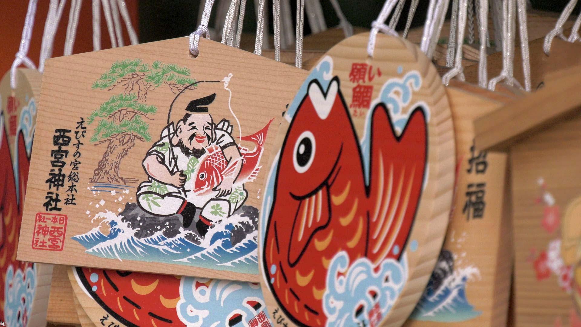 手には釣り竿、大きな鯛を抱え、穏やかな笑みがこぼれる。『福の神』でおなじみの『えびす大神』。幼い時に、海に流されながらも漁師によって引き上げられ、『豊漁の神』として、自らが望む地に祀られたえびすさま。後に町が発達すると『商売繁盛の神』。信仰が全国に広がると幸運をもたらす『福の神』とその御神徳を深められました。新年早々の祭り、『十日えびす』は多くの人々で賑わいます。
